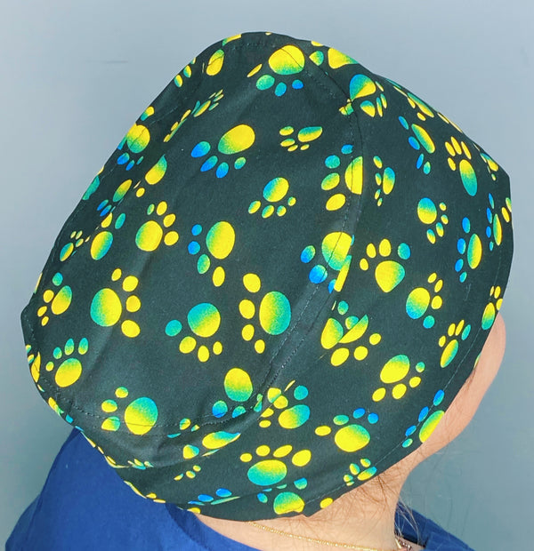 Our Euro Style scrub hat features an adjustable cord stop at the base making adjustable, comfortable and an exact fit. Handmade from 100% cotton in the USA. The front part lays flat and comfortably against your forehead measuring approx 7", while the pleating on the back creates a stylish and fun slouchy bouffant look, great for long or short hair to wear all day long.