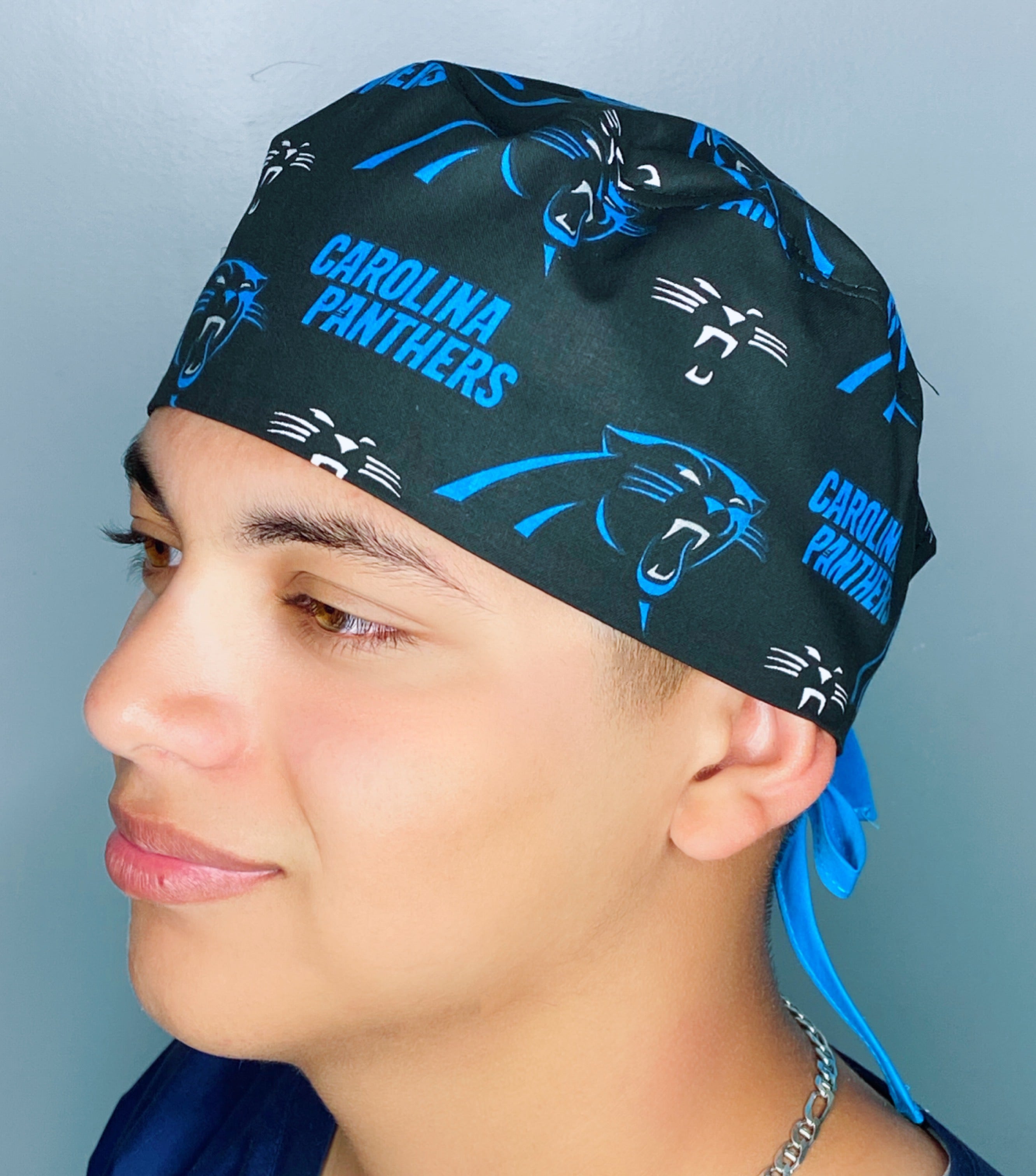 Our Unisex Scrub Caps measure 4.25" in the front, designed for short hair, comes with coordinating solid color straps that tie at the back making it totally adjustable 22" - 25" in circumference, and can be folded up without showing the wrong side of cap. The cap is double lined with 100% black cotton fabric to absorb perspiration and making it very comfortable to wear all day long.