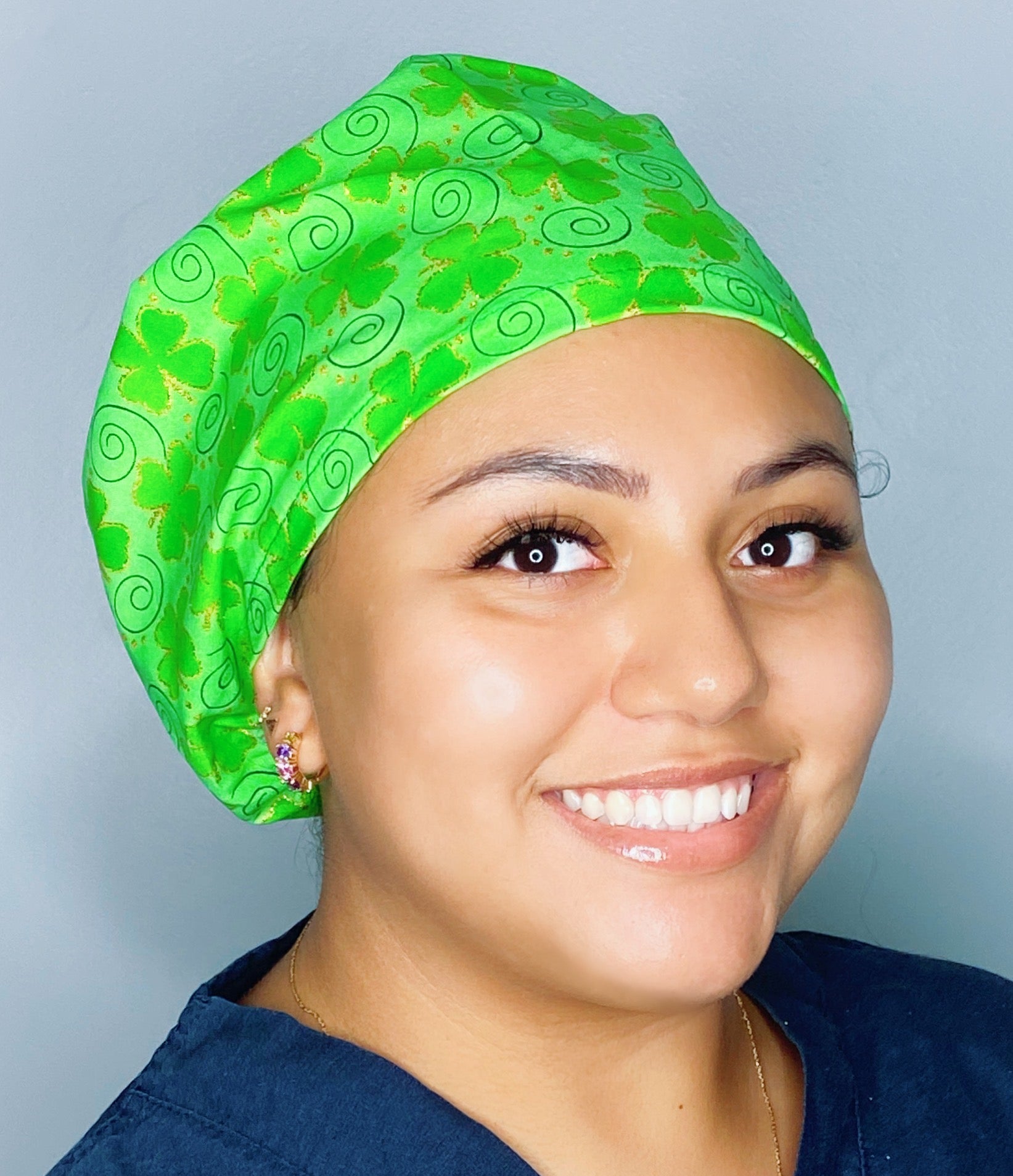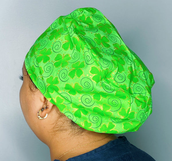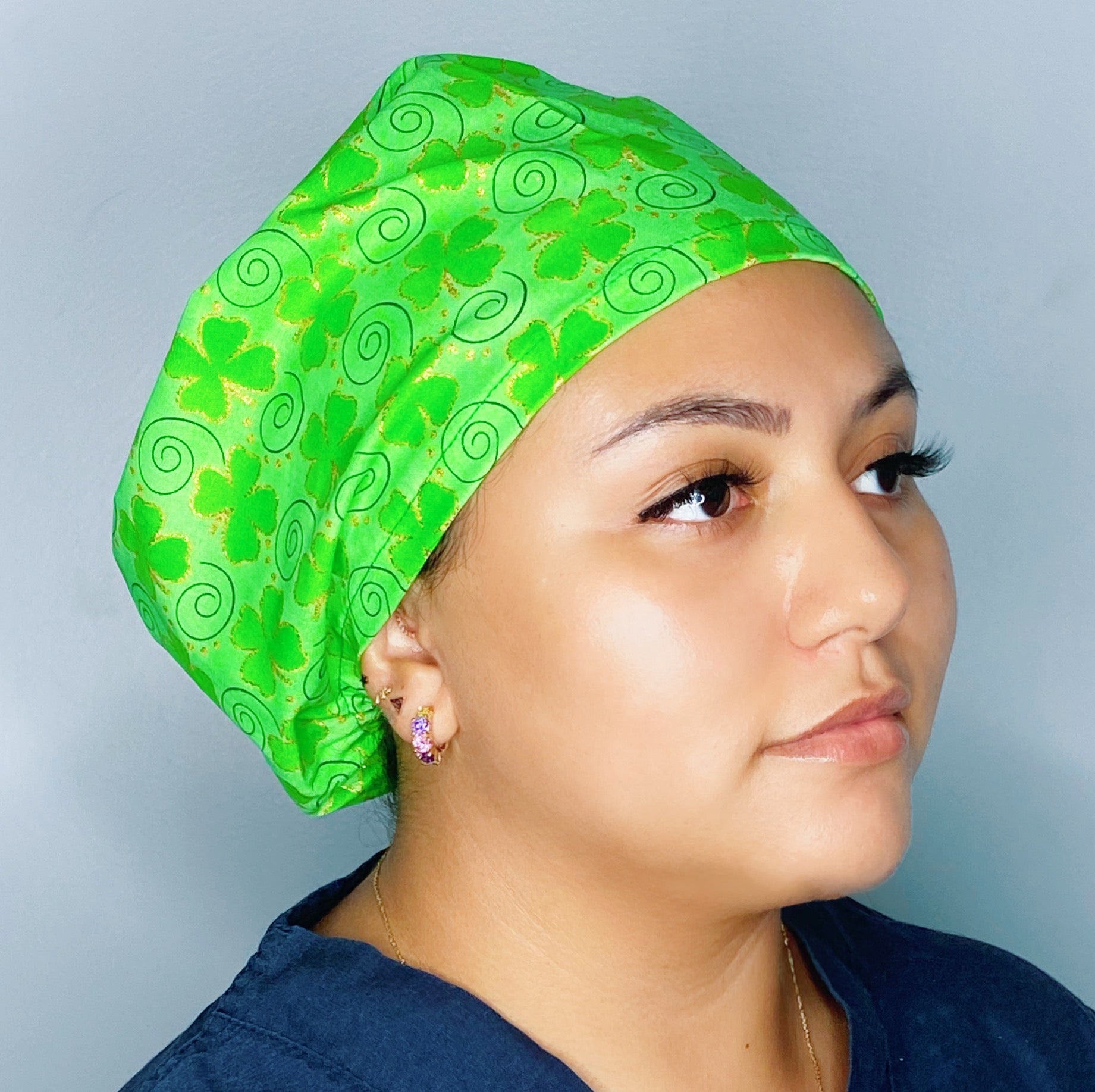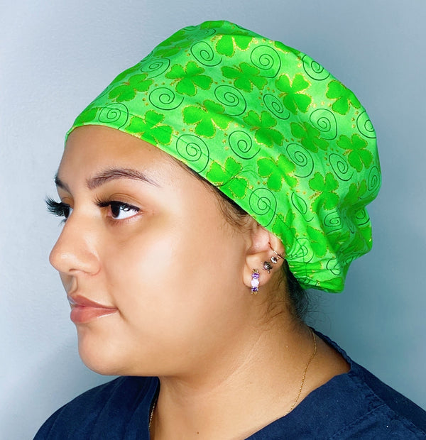 Our Euro Style scrub hat features an adjustable cord stop at the base making adjustable, comfortable and an exact fit. Handmade from 100% cotton in the USA. The front part lays flat and comfortably against your forehead measuring approx 7", while the pleating on the back creates a stylish and fun slouchy bouffant look, great for long or short hair to wear all day long.