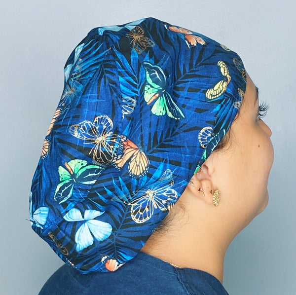 Our Euro Style scrub hat features an adjustable cord stop at the base making adjustable, comfortable and an exact fit. Handmade from 100% cotton in the USA. The front part lays flat and comfortably against your forehead measuring approx 7", while the pleating on the back creates a stylish and fun slouchy bouffant look, great for long or short hair to wear all day long.