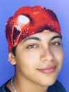 Our Unisex Scrub Caps measure 4.25" in the front, designed for short hair, comes with coordinating solid color straps that tie at the back making it totally adjustable 22" - 25" in circumference, and can be folded up without showing the wrong side of cap. The cap is double lined with 100% black cotton fabric to absorb perspiration and making it very comfortable to wear all day long.