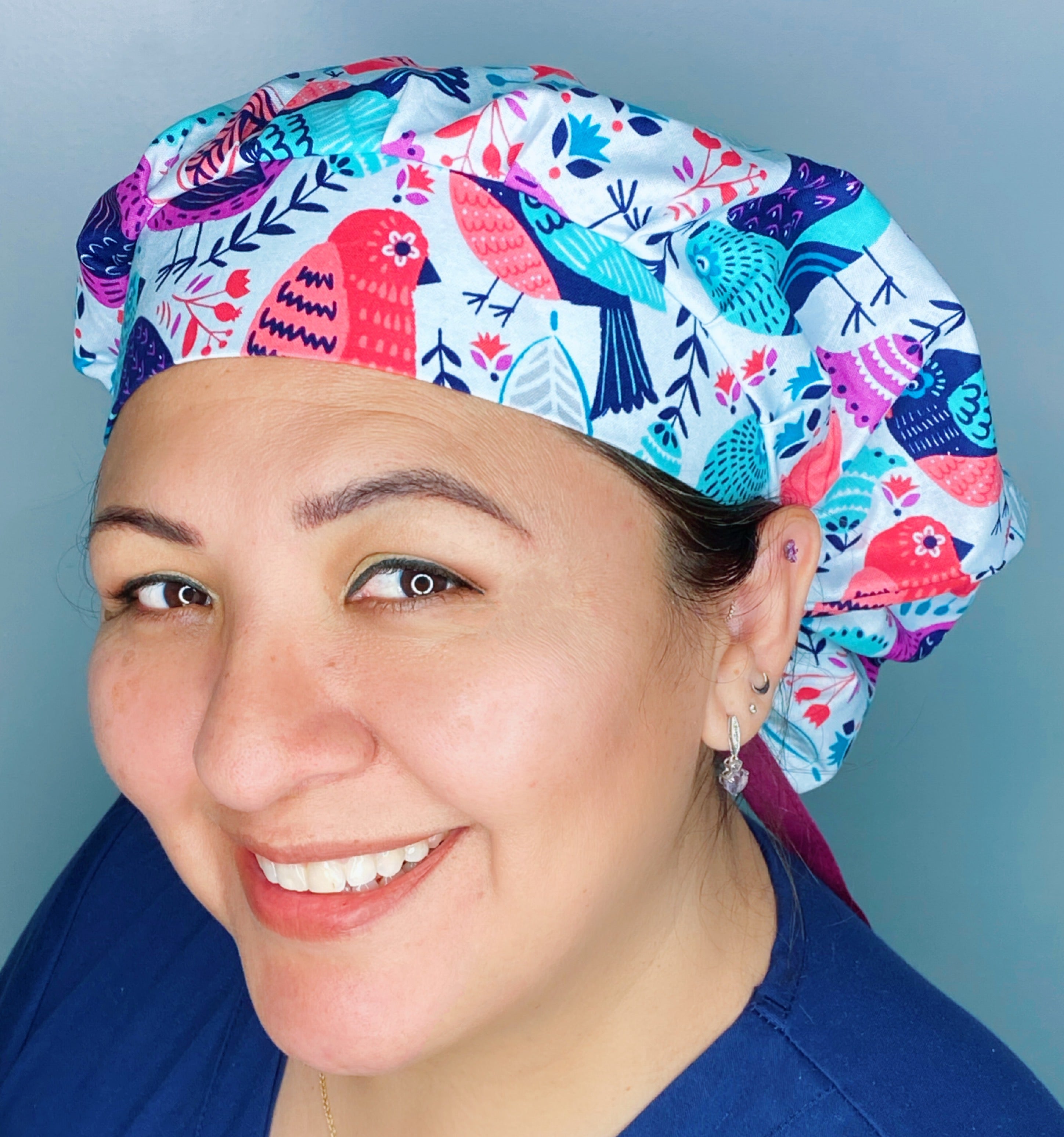 Our bouffant scrub hats feature both an adjustable cord stop and a little “belt loop” at the base for the ties to go through, you may choose to wear it as a regular bouffant or tie it in the back to make it a new "ponytail" like look. The headband lays flat and comfortably against your forehead, while the pleating creates a stylish and fun bouffant look, great for long or short hair to wear all day long.