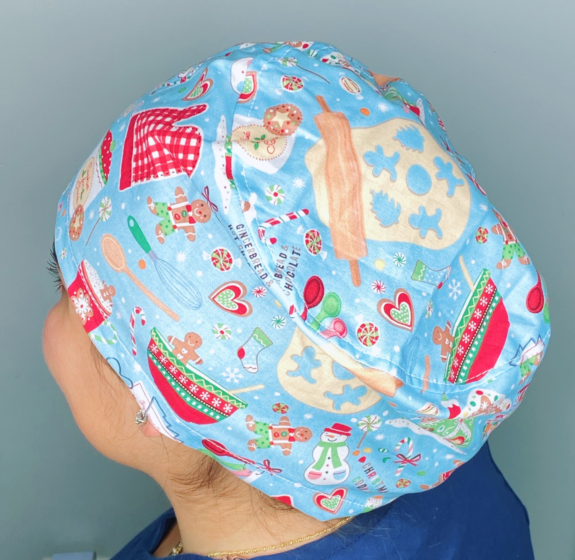 Our Euro Style scrub hat features an adjustable cord stop at the base making adjustable, comfortable and an exact fit. Handmade from 100% cotton in the USA. The front part lays flat and comfortably against your forehead measuring approx 7", while the pleating on the back creates a stylish and fun slouchy bouffant look, great for long or short hair to wear all day long.